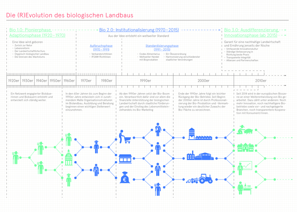 Rechteinhaberin: BIO-WISSEN.org / Grafik: Andreas Pawlik (dform), Maximilian Fabigan / Redaktion: Reinhard Gessl, Elisabeth Klingbacher (FIBL Österreich), Alexander Martos (Science Communications Research) / Copyright: »Die (R)Evolution des biologischen Landbaus« von BIO-WISSEN.org ist lizenziert unter einer Creative Commons Namensnennung 4.0 International Lizenz.