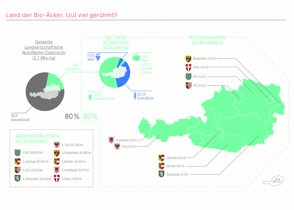 Rechteinhaberin: BIO-WISSEN.org / Grafik: Andreas Pawlik (dform), Maximilian Fabigan / Redaktion: Reinhard Gessl, Elisabeth Klingbacher (FIBL Österreich), Alexander Martos (Science Communications Research) / Copyright: »Land der Bio-Äcker, (zu) viel gerühmt?« von BIO-WISSEN.org ist lizenziert unter einer Creative Commons Namensnennung 4.0 International Lizenz.