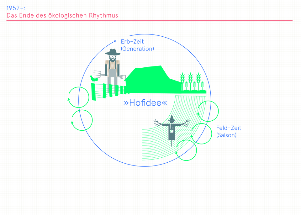 Ein entscheidener Takt der „Hofidee“, der mit rund 30 Jahren beschrieben werden kann, ist die Generation. Die Hofübergabe, die meist auch mit der Heirat des neuen Bauern verbunden war, zog sich oft lange hin, ermöglichte aber auch technologische Innovationen. Das langfristige, über das eigene Leben hinaus gehende, Denken, bildet den Horizont für verschiedene saisonale Rhythmen. Das mitteleuropäische Klima und der Wechsel der Jahreszeiten prägen diese ebenso wie die spezifischen Rhythmen von Tier- und Pflanzenproduktion. Dabei begann man auch an diesen scheinbaren Konstanten zu intervenieren: So konnte die Entwicklung von Legehennen durch künstliche Beleuchtung ebenso verändert werden, wie die Reproduktion der Tiere durch künstliche Besamung. Auch der Boden verfügt über eine gewisse Eigenzeitlichkeit, ist er doch als „träges Medium“ bekannt. In ihm wirken sich Eingriffe und Maßnahmen erst über einen längeren Zeitraum aus. Um ihn zu studieren plädieren auch die Agrarwissenschaften in Form von Langzeit- und Dauerversuchen für eine longue durée am Feld. Die Brache, also das Nicht-Bestellen des Feldes für eine Saison, die noch in der 3-Felder-Wirtschaft üblich war, erscheint in dieser Hinsicht heute als eine geradezu verschwenderische Zeitmaßnahme.