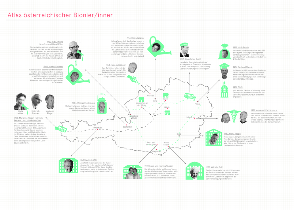 Die österreichische Biolandwirtschaft blickt auf eine lange Geschichte zurück. Viele starke Persönlichkeiten haben seit den 1920er Jahren die biologische Landwirtschaft geprägt und trugen im Lauf der Jahre zur erfolgreichen Entwicklung des Biolandbaus bei. Einige der wesentlichen österreichischen Wegbereiter/innen und »Bionier/innen« werden in ihrem Wirkungskreis auf der Österreichkarte präsentiert.