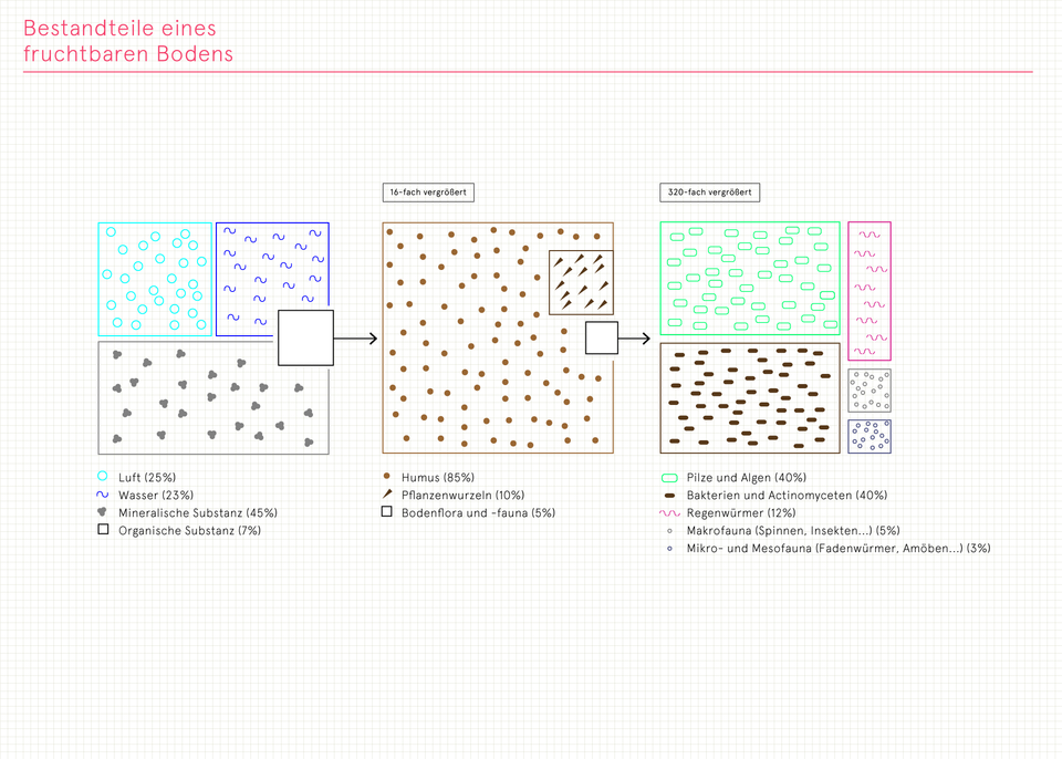 Titel: Bestandteile eines fruchtbaren Bodens / Rechteinhaberin: BIO-WISSEN.org / Grafik: Juliane Sonntag / Redaktion: Reinhard Gessl, Elisabeth Klingbacher (FIBL Österreich), Alexander Martos (Science Communications Research) / Copyright: Bestandteile eines fruchtbaren Bodens von BIO-WISSEN.org ist lizenziert unter einer Creative Commons Namensnennung 4.0 International Lizenz.