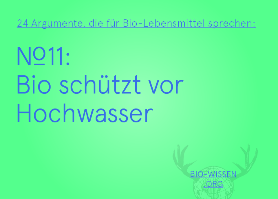 Vergleichsuntersuchungen zeigen, dass aufgrund der deutlich besseren Infiltrationsrate das Wasserrückhaltepotential biologisch bewirtschafteter Böden um 39 % über dem von konventionell bewirtschafteten Flächen liegt. Das heißt, Bio-Böden können deutlich mehr Wasser aufnehmen als intensiv bewirtschaftete Flächen. Hauptgrund sind die bessere Boden- und Porenstruktur, wodurch das Wasser schnell in tiefere Bodenschichten transportiert wird. Aufgrund des stabilen Krümelgefüges saugt ein fruchtbarer Bio-Boden auch starke Platzregen auf wie ein Schwamm. Auch die erhöhte Regenwurmpopulation unter Biobewirtschaftung spielt eine zentrale Rolle, da durch die Gänge der Regenwürmer das Regenwasser in tiefere Bodenschichten geleitet wird. All diese Faktoren vermindern den Anteil des Oberflächenabflusses in Bäche und Flüsse. Somit leistet der Biolandbau einen wichtigen Beitrag, Intensität von Hochwässern und Bodenerosion zu mindern. Die flächenmäßige Ausdehnung des Biolandbaus ist somit gleichbedeutend mit aktivem Hochwasserschutz.