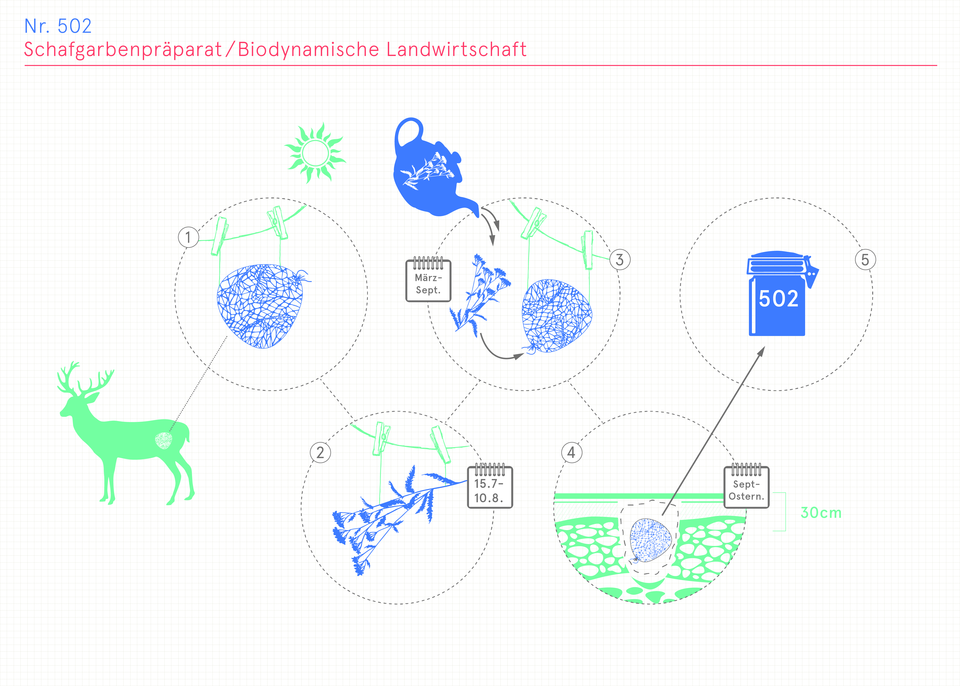 Titel: Biodynamisches Präparat 502: Schafgarbe / Rechteinhaberin: BIO-WISSEN.org / Grafik: Andreas Pawlik, Maximilian Fabigan /dform) / Redaktion: Reinhard Gessl, Elisabeth Klingbacher (FIBL Österreich), Alexander Martos (Science Communications Research) / Copyright: Biodynamisches Präparat 502: Schafgarbe von Bio-Wissen ist lizenziert unter einer Creative Commons Namensnennung 4.0 International Lizenz.