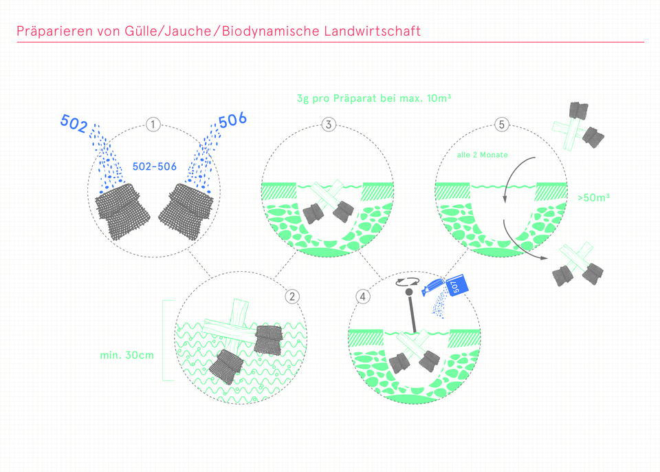 Zubereitung: Die Präparate werden in einen mit einem Stein beschwerten Stoffbeutel gegeben (1). Die einzelnen Stoffbeutel werden in einem Mindestabstand von 30 cm an ein Holzkreuz oder an eine Stange gebunden und in die Jauche oder Gülle getaucht (2). Für einen Grubenraum von 8-10 m3 benötigt man je Präparat ca. 3g (3). Das Baldrianpräparat wird gerührt und in die Jauche bzw. Gülle gegossen (4). Bei Gruben ab 50 m3 werden die Präparate nach 2 Monaten erneuert (5). Große Gruben sollten mindestens 5 Monate Zeit zum Gären haben. Auch bei den Flüssigdüngern kann man im wöchentlichen Abstand die mit Hilfe feuchter Erde zu Kugeln geformten Präparate in den Schwemmkanal werfen.