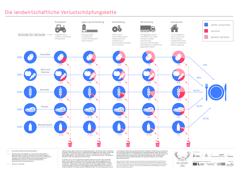 Rechteinhaberin: BIO-WISSEN.org / Grafik: Andreas Pawlik (dform), Maximilian Fabigan / Redaktion: Reinhard Gessl, Elisabeth Klingbacher (FIBL Österreich), Alexander Martos (Science Communications Research) / Copyright: »Die landwirtschaftliche Verlustschöpfungskette« von BIO-WISSEN.org ist lizenziert untereiner Creative Commons Namensnennung 4.0 International Lizenz.