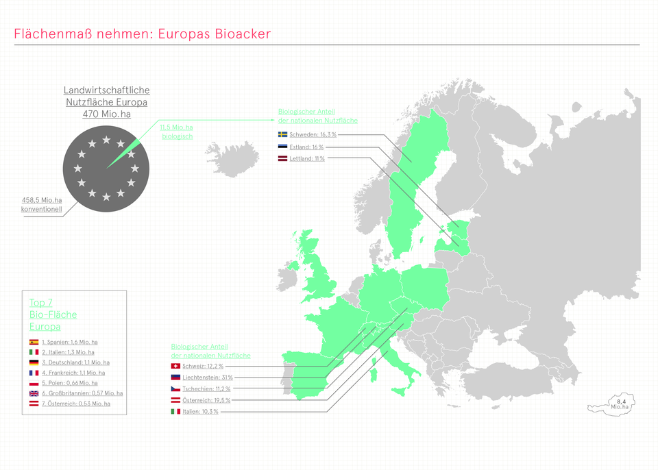 In den Top 7 der Bio-Flächen in Europa ist Spanien mit 1,6 Mio. ha an erster Stelle, Italien ist mit 1,3 Mio. ha Zweiter, Österreich ist auf Platz 7 mit 0,53 Mio. ha.