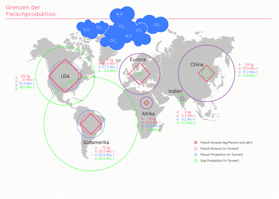 Die Weltfleischproduktion liegt bei 300 Mio. Tonnen/Jahr und soll sich bis 2050 noch verdoppeln. Der hohe Fleischkonsum hat neben ethischen und gesundheitlichen Konsequenzen erhebliche Auswirkungen auf die Umwelt. Innerhalb der Landwirtschaft ist die Fleischproduktion für den Großteil der klimarelevanten Treibhausgasemissionen verantwortlich. Während der Fleischkonsum in den Industrieländern auf sehr hohem Niveau stagniert (USA 120 kg bzw. EU 85 kg/Person/Jahr), hat er sich in China binnen 30 Jahren vervierfacht. In den meisten afrikanischen Ländern und Indien liegt der Pro-Kopf-Verbrauch deutlich unter 10 kg/Jahr.