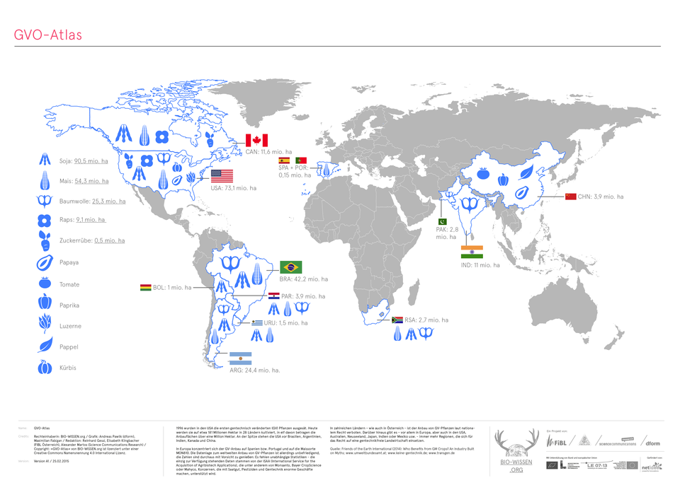 Rechteinhaberin: BIO-WISSEN.org / Grafik: Andreas Pawlik (dform), Maximilian Fabigan / Redaktion: Reinhard Gessl, Elisabeth Klingbacher(FIBL Österreich), Alexander Martos (Science Communications Research) / Copyright: »GVO-Atlas« von BIO-WISSEN.org ist lizenziert unter einer Creative Commons Namensnennung 4.0 International Lizenz.