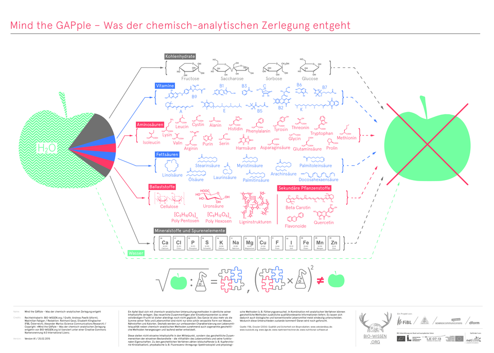 Rechteinhaberin: BIO-WISSEN.org / Grafik: Andreas Pawlik (dform), Maximilian Fabigan / Redaktion: Reinhard Gessl, Elisabeth Klingbacher (FIBL Österreich), Alexander Martos (Science Communications Research) / Copyright: »Mind the GAPple – Was der chemisch-analytischen Zerlegung entgeht« von BIO-WISSEN.org ist lizenziert unter einer Creative Commons Namensnennung 4.0 International Lizenz.