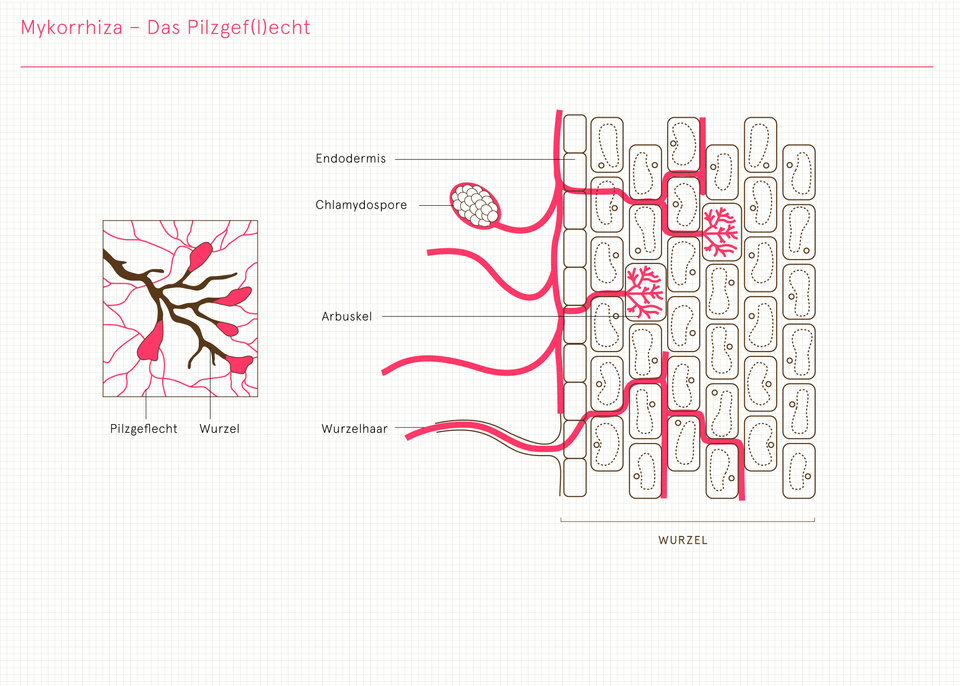Jenseits unserer Wahrnehmung hat sich vor Millionen von Jahren ein Netzwerk ungeahnten Ausmaßes gebildet – die unterirdische Verbindung von Pflanzenwurzeln und Mykorrhizapilzen. Diese Pilze dringen mit ihren Hyphen in die Zellen der Wurzelrinde ein und durchwachsen gleichzeitig den Boden. Die feinen Hyphen nehmen Wasser, Phosphor und andere Nährstoffe, die für die Pflanzenwurzeln nicht erreichbar sind, aus dem Boden auf. Sie erleichtern den Stoffaustausch und schützen die Wurzel vor Krankheitserregern. In der Wurzelrinde sorgen bäumchenartige Pilzstrukturen, die Arbuskeln, für optimalen Stoffaustausch. Und auch die Pilze profitieren. Sie erhalten von der Pflanze Kohlenhydrate, die sie in Fette umwandeln und in Speicherversikeln in der Wurzel „lagern“. Über 80 % aller Landpflanzen sind über Pilzgeflechte miteinander verwoben und können darüber auch mit ihren Nachbarinnen kommunizieren, um sie z. B. vor Gefahren wie Schädlingen zu warnen. Vor allem der Verzicht auf Pestizide und Mineraldünger – wie im Biolandbau klar geregelt – wirkt sich positiv auf diese faszinierende Symbiose aus.