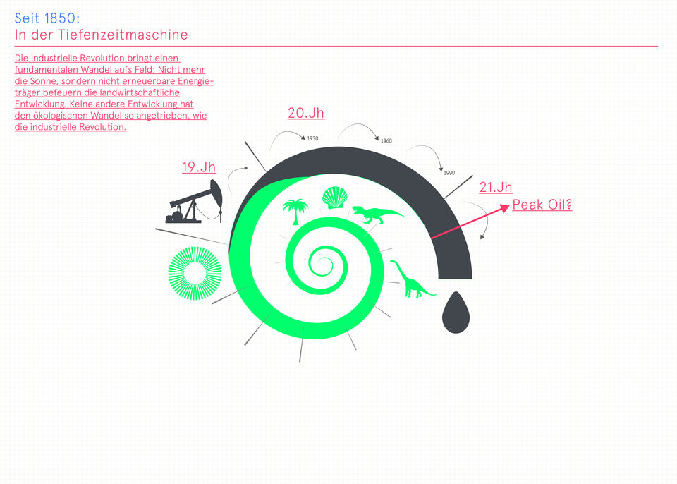 Die industrielle Revolution bringt einen fundamentalen Wandel aufs Feld: Nicht mehr die Sonne, sondern nicht erneuerbare Energieträger befeuern die landwirtschaftliche Entwicklung.