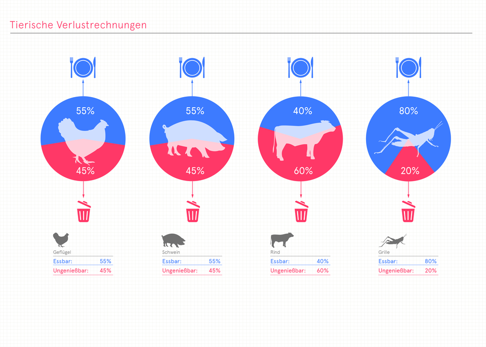 Insekten lassen sich so ziemlich vollständig verwerten, während von Rind, Schwein und Huhn teilweise nur die Hälfte auf unseren Tellern landet. Das liegt allerdings mitunter auch an unseren Konsumgewohnheiten. Diese sind dafür verantwortlich, dass vom Tier meist deutlich weniger gegessen wird als eigentlich möglich wäre – was ökologisch, ökonomisch und ethisch durchaus kritisch zu sehen ist.