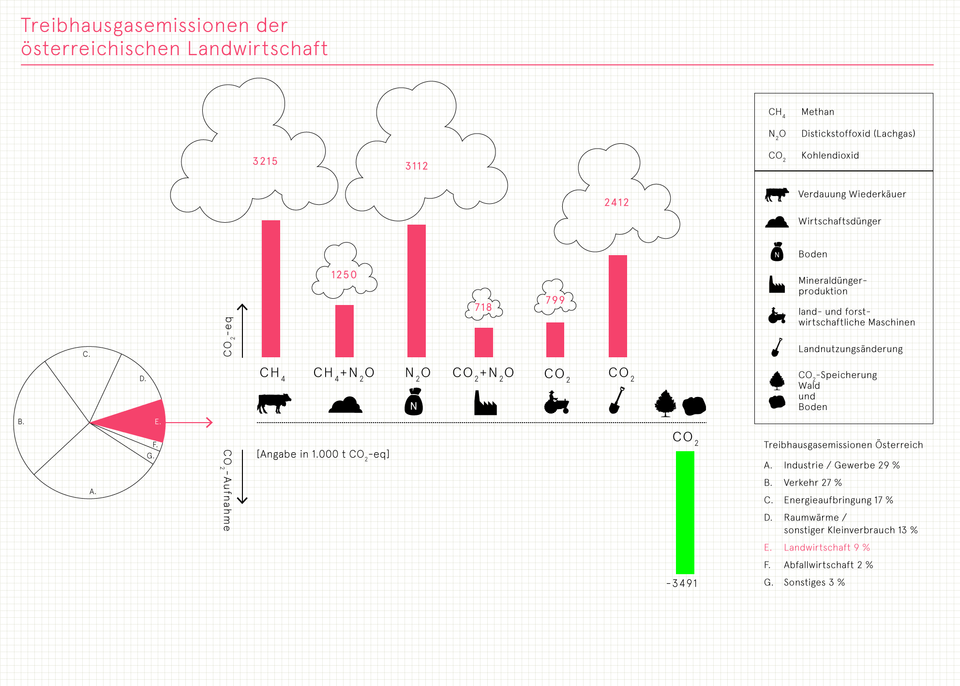 Titel: Treibhausgasemissionen der österreichischen Landwirtschaft / Rechteinhaberin: BIO-WISSEN.org / Grafik: Juliane Sonntag / Redaktion: Reinhard Gessl, Elisabeth Klingbacher (FiBL Österreich), Alexander Martos (Science Communications Research) / Copyright: Treibhausgasemissionen der österreichischen Landwirtschaft von BIO-WISSEN.org ist lizenziert unter einer Creative Commons Namensnennung 4.0 International Lizenz.